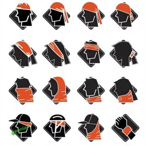 - Peut se porter de 12 manières différentes (par ex., sur la tête, en bandeau, en bonnet, en cagoule, en bandana, en écharpe, en brassard, etc.).