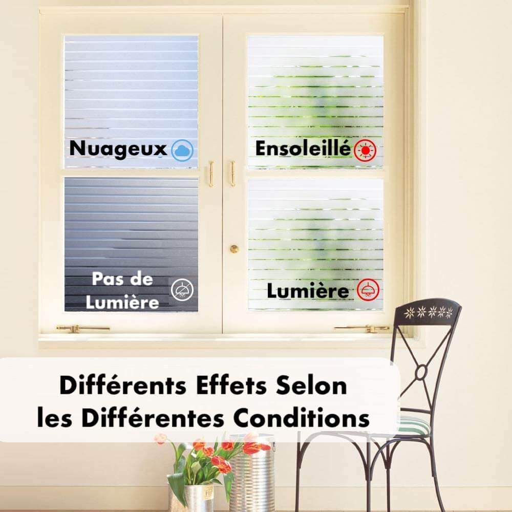 - Protection de vie privé : On peut voir à travers de très près et bloque la vue de loin. Fournit la confidentialité et permet aux lumières d'entrer.