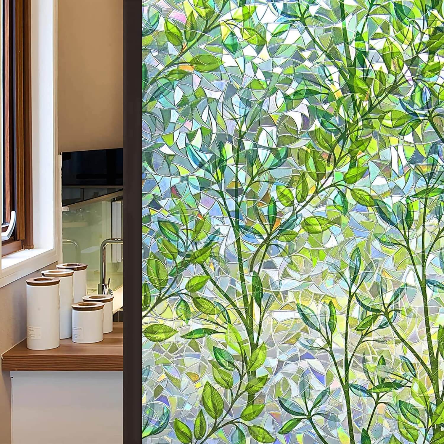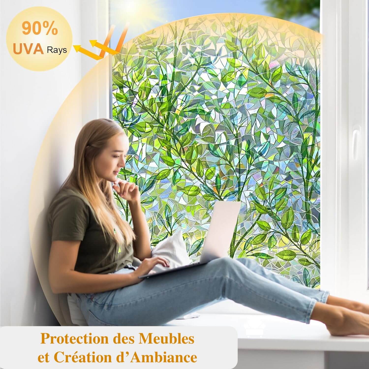 Film Adhésif Décoratif pour Fenêtre 3D Anti-regards - Motif Feuilles Arc-en-ciel