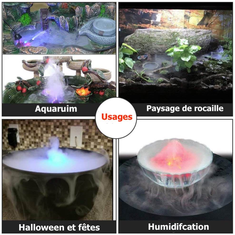 - Le vaporisateur ajoute beaucoup de brume à votre bassin ou votre char et filtre les mauvaises odeurs grâce à la technologie électronique et ultrasonique. Vous pouvez le placer dans votre étang, jardin en pierre, bassin, vase, bassin, fontaine etc. Il crée une atmosphère magique.